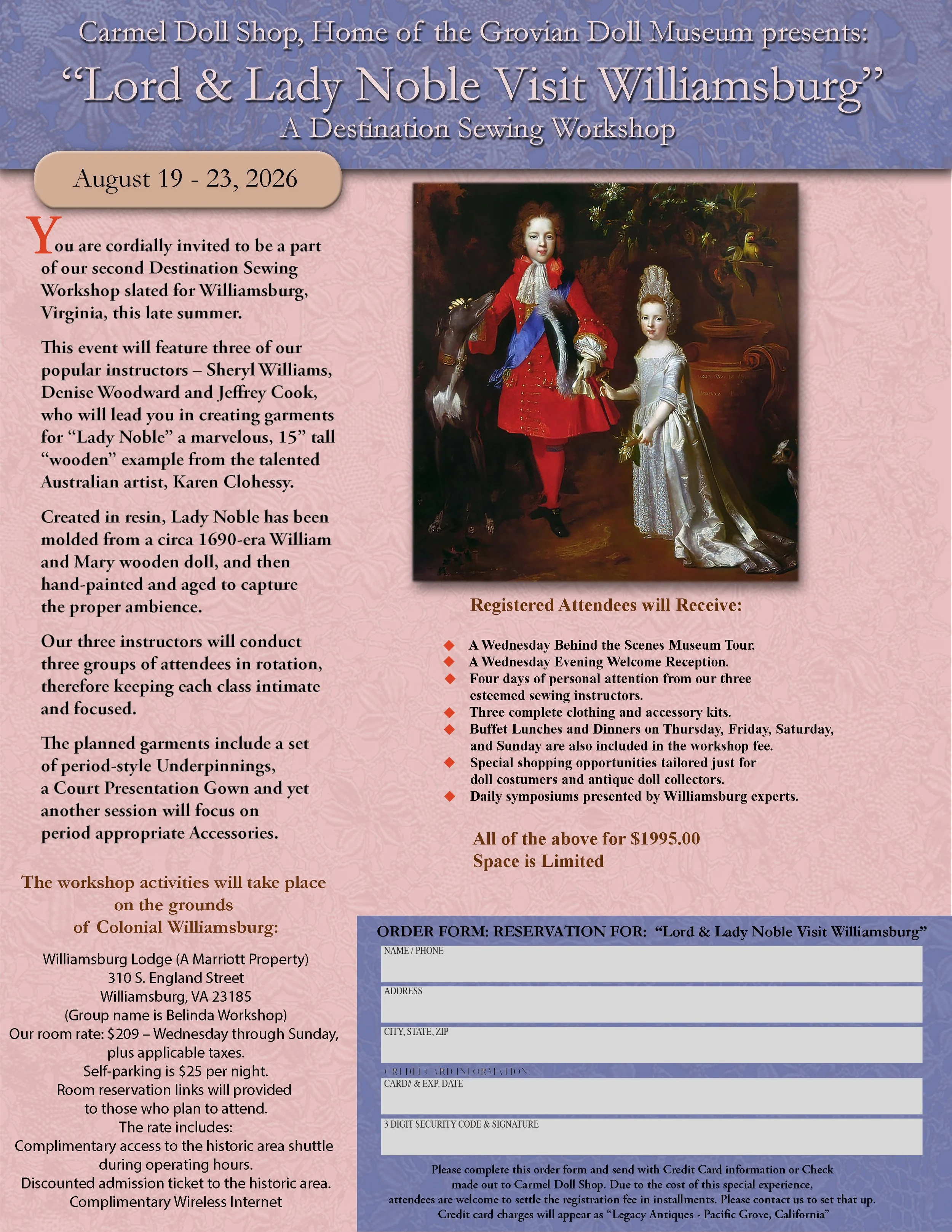 “Lord & Lady Noble Visit Williamsburg” A Destination Sewing Workshop Wednesday, August 19, 2026 5:00 PM 17:00 Sunday, August 23, 2026 6:00 PM 18:00 Google Calendar ICS